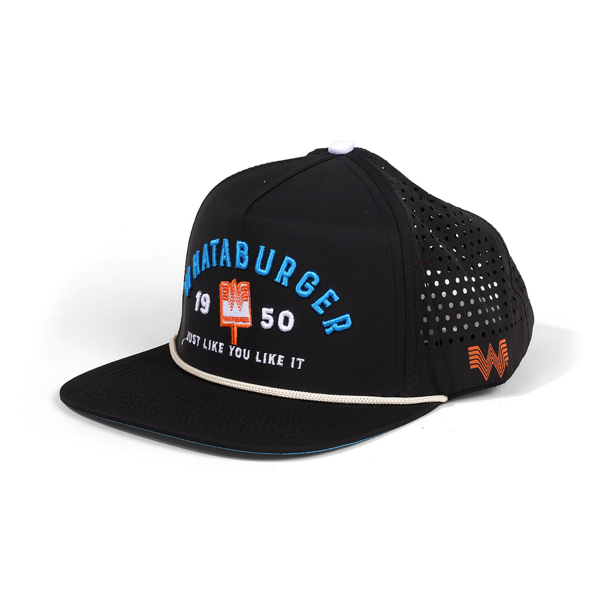 This Black Summer Sign Staunch Collection Hat brings a splash of fun with its light blue bottom bill and cream rope detail. Embroidered with the Whataburger logo and classic pole sign, as well as “1950” and the iconic phrase “Just Like You Like It,” it’s the perfect way to show off your love for timeless style and tasty traditions. Wear it and keep cool while turning heads wherever you go!