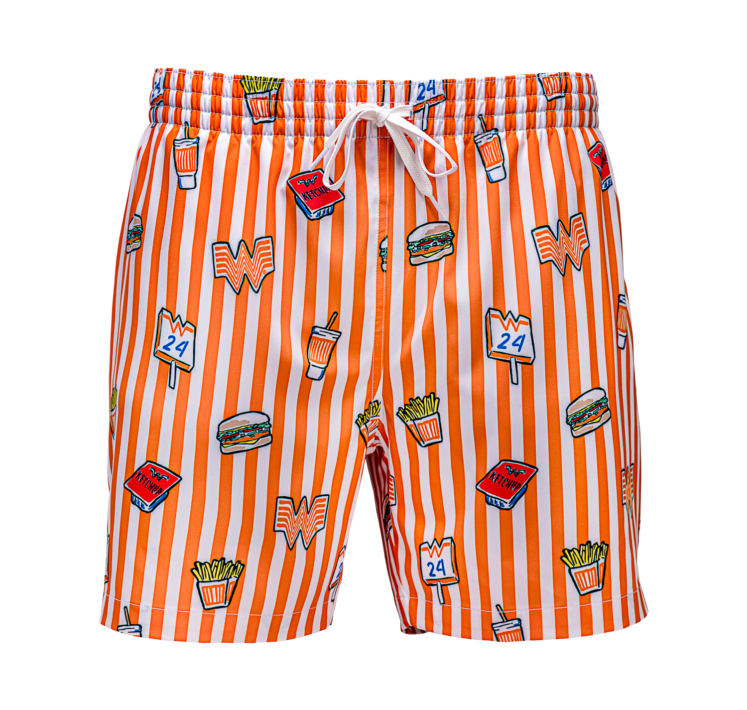 Make a splash in these playful Chubbies® Striped Swim Trunks! Featuring iconic Whataburger symbols and bright orange and white stripes, these swim trunks are sure to turn heads. Dive in and stand out with these fun and quirky swim trunks!