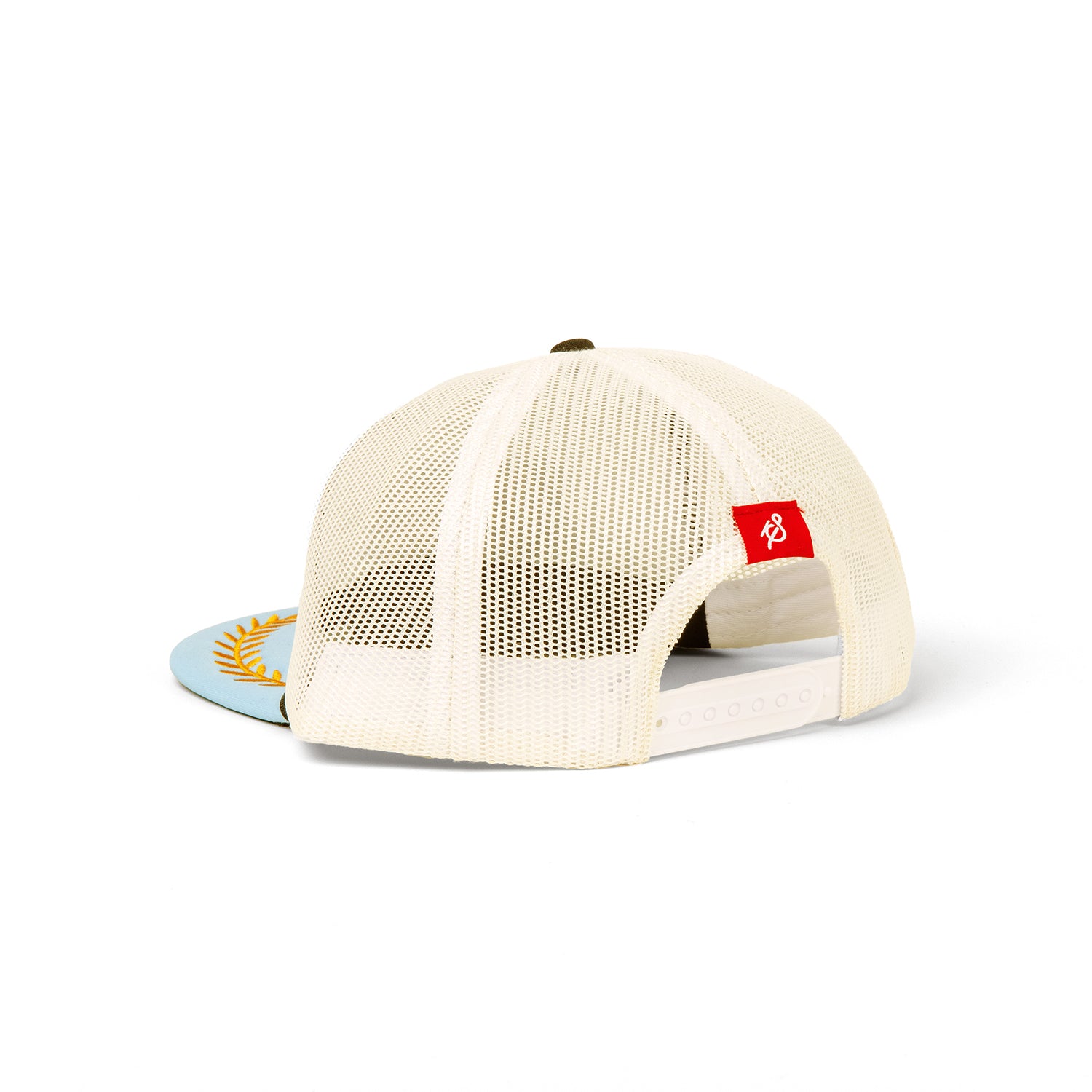 – Color: Cream Foam Front with Light Blue and Gold top bill and black rope detail
