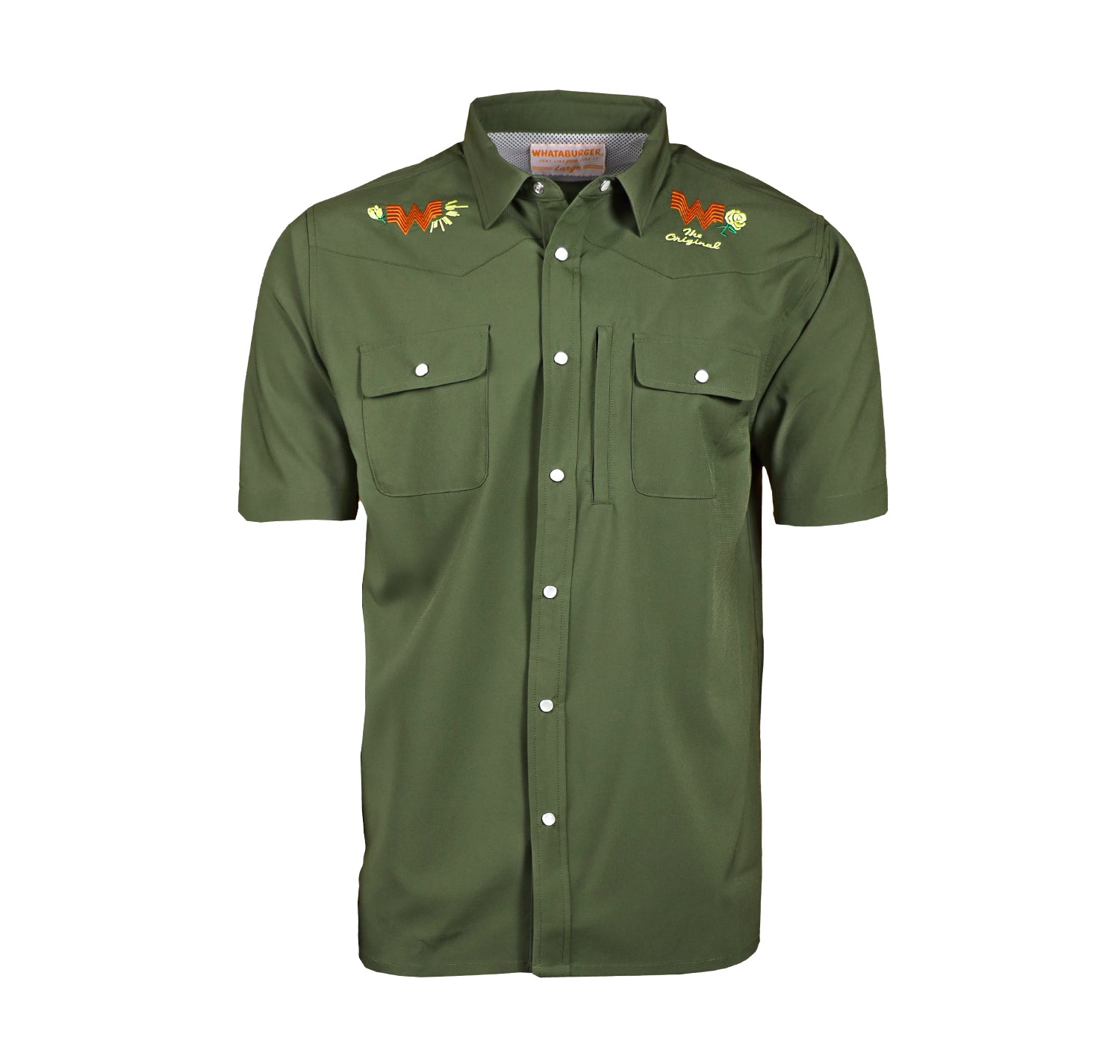 Catch compliments and fish in style with our Green Fishing Shirt! Made with performance material and featuring a pearl snap closure, this shirt is perfect for any occasion. Plus, the unique yellow rose of Texas design adds a touch of personality to your wardrobe. Reel in this one-of-a-kind shirt now!