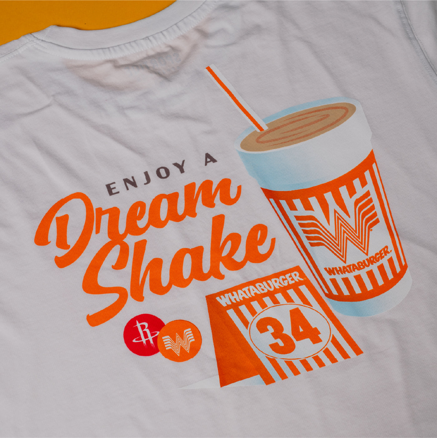 Designed to go from courtside to curbside—and everywhere in between—the Houston Rockets x Whataburger collab fuses bold style and easy, laid-back wearability. The Dream Shake White Tee is aWhite pocket tee inspired by Hakeem Olajuwon’s signature move with references to Whataburger shakes and his number as a Whataburger table tent.