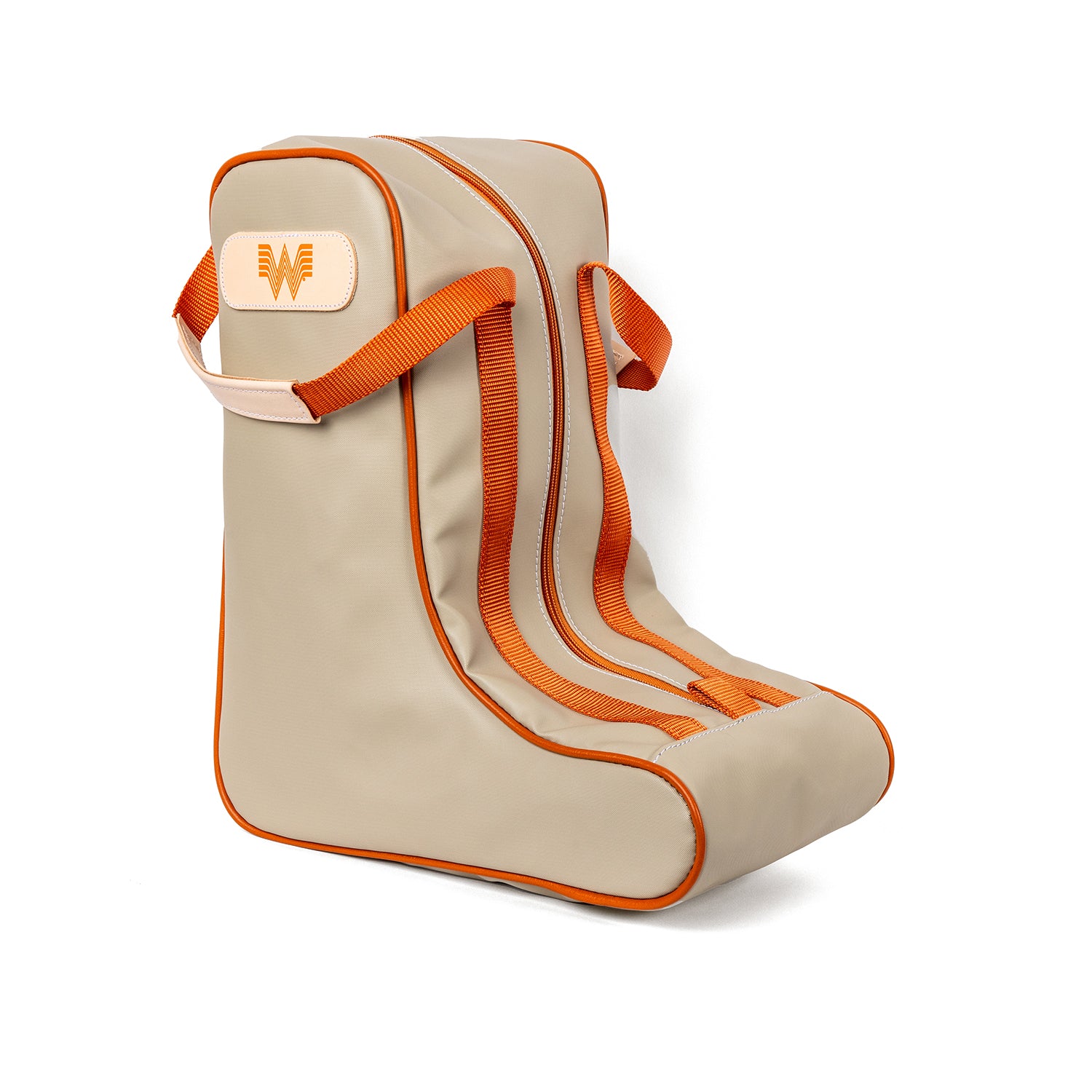This limited-edition Whataburger Boot Bag is the ultimate solution for storing & transporting your favorite boots. Designed with convenience in mind, this boot bag features a spacious main compartment that comfortably fits a pair of boots up to a size 14 and a small elastic, lining pocket on the inside for socks and other small needs. Made of Tan Coated Canvas with Orange Leather trim and orange accents.