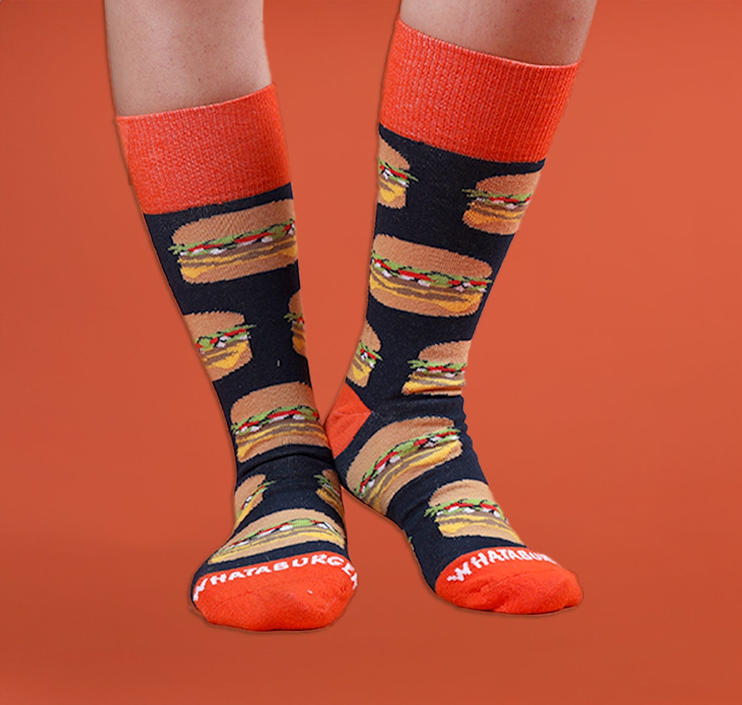 The #1 burger is now your #1 pair of socks! Add some flavor to your wardrobe with our Navy Burger Build Socks. With a unique design featuring repeating Whataburgers, these navy and orange dress socks are perfect for the burger lover in your life. Grab a pair and step up your sock game!