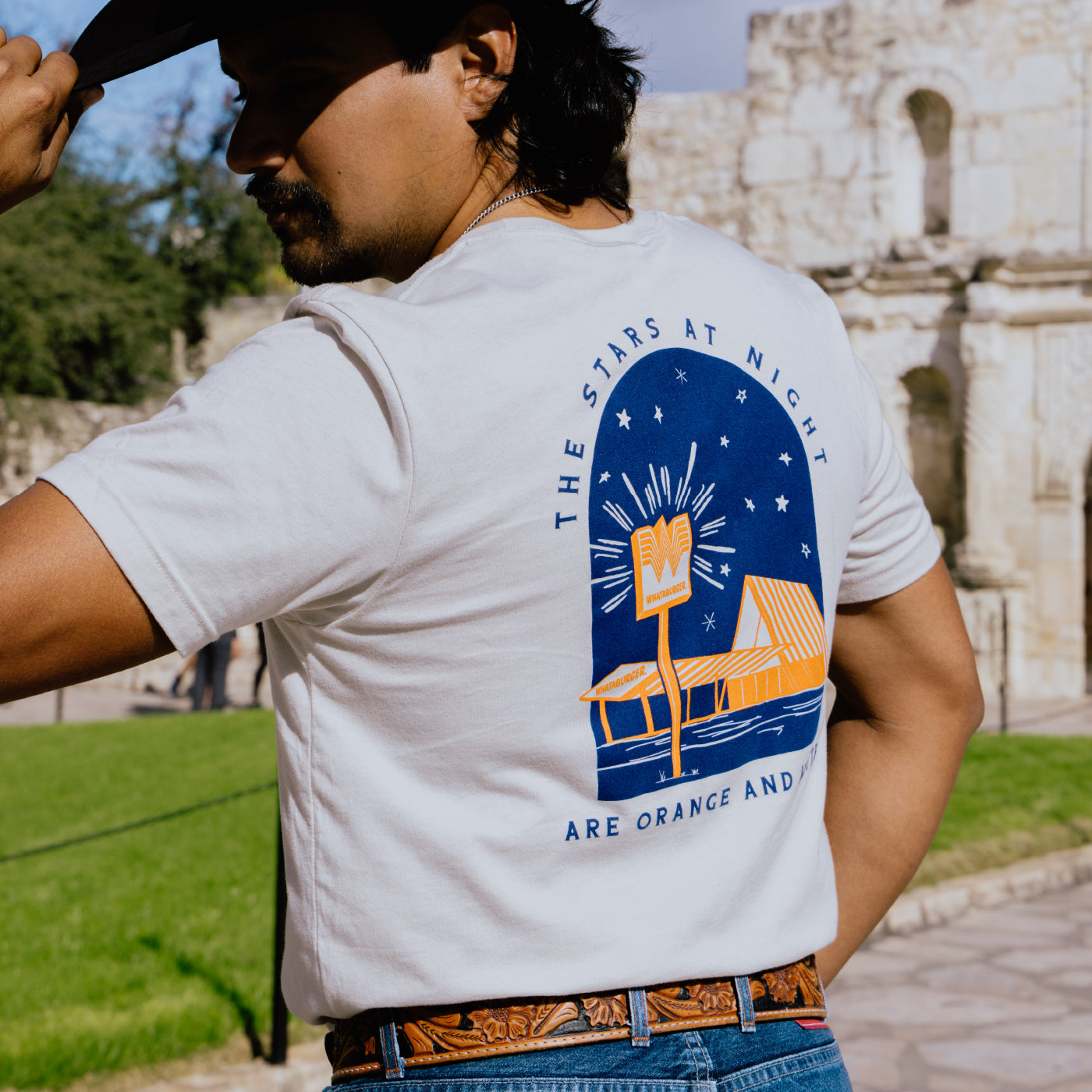 Get nostalgic with our Stars At Night Tee! This cream colored tee features a nod to the iconic Whataburger pole sign on the front, and the restaurant itself on the back. The stars at night are orange and white when you’re making a Whataburger run!