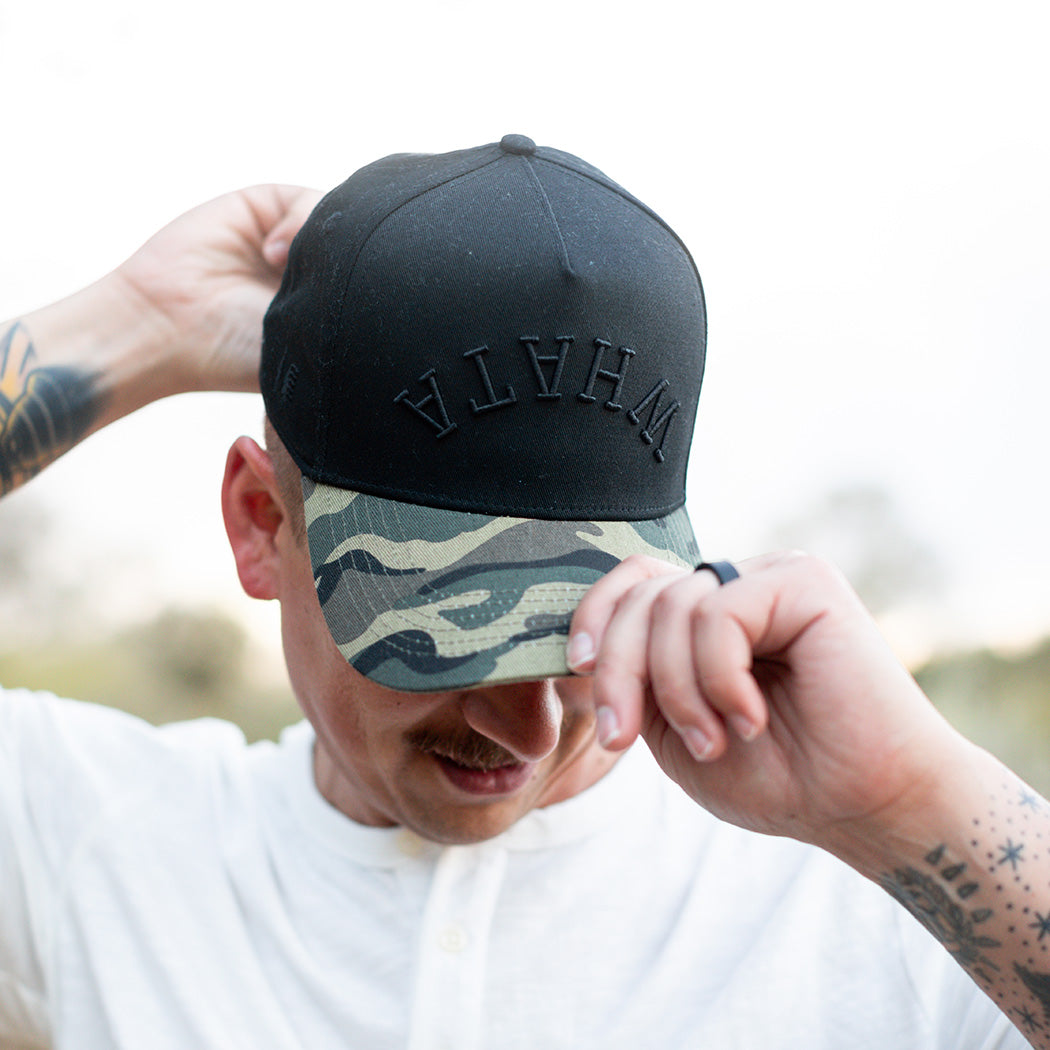 Get ready to turn heads with the True Brvnd® Black Camo Whataburger Hat! Made with 100% cotton, this structured snapback hat features an upside down tone-on-tone black WHATA design on a sleek black hat, paired with a stylish camo bill. Show off your love for Whataburger in a unique and trendy way.